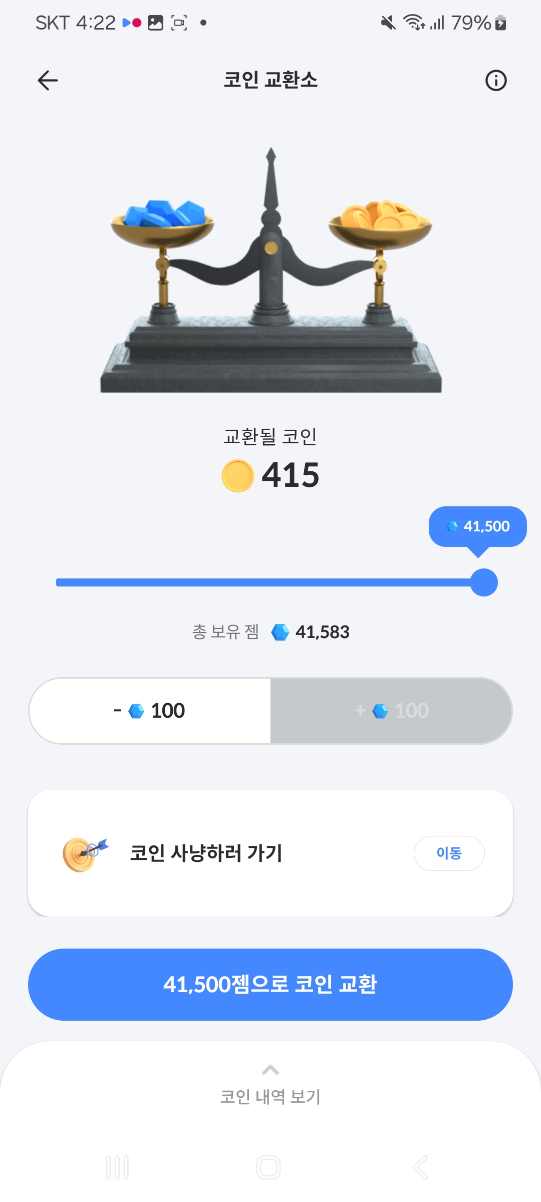 처음에는 저도 잘 모를때 모든 젬이 코인으로 교환이 가능한것으로 알고 약 5일동안 젬만 모였는데 이게 나중에 하루에 교환이 가능한 양이 정해졌다는것을 알고 하루에 꼭 한번은 교환을 하고 나머지는 다 레벨을 올리는데 사용을 하고 있습니다. 게임을 많이 했다면 중간에 한번 코인으로 교환을 하는것을 추천을 드립니다. 100젬은 1코인으로 교환을 하게됩니다.